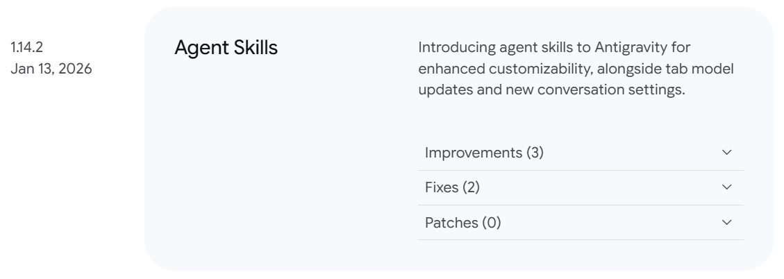 이 덕분에 최근 OpenAI뿐만 아니라 구글에서도 Gemini CLI와 Antigravity를 통해 스킬(Skills) 을 공식 지원하기 시작했습니다. (2026.1.14 업데이트)