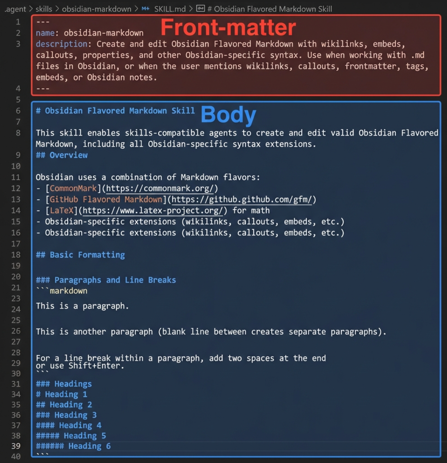 가장 중요한 SKILL.md 파일은 크게 두 부분으로 나뉩니다.