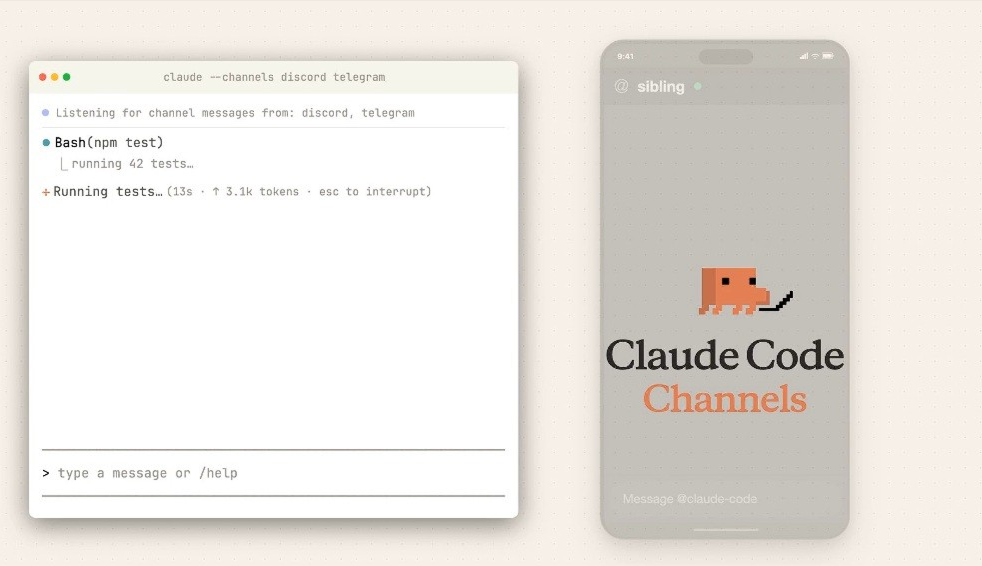 그리고 클로드 코드 채널(Claude code channels) 은 앤트로픽(Anthropic)에서 오픈클로와 유사한 수요를 충족시키기 위해 출시한 기능으로, 터미널 환경에서 구동되는 클로드 코드(Claude Code) 세션을 외부 모바일 메신저 등과 연동해 주는 공식 채널 기능입니다.