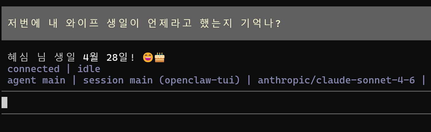 - 영구적 메모리(Context): 단일 세션 단위로 동작하는 채널과 달리, 오픈클로는 주 단위 이상의 대화 이력과 맥락을 지속적으로 기억합니다.