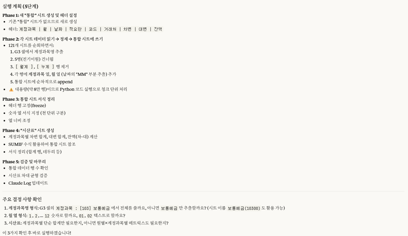 즉, 복잡한 작업일수록 한 번에 너무 많은 지시를 내리기보다는 잘게 쪼개어 단계별로 진행하는 것이 좋습니다. 클로드 엑셀에는 아직 클로드 코드(Claude Code)나 안티그래비티(Antigravity) 같이 독립된 '계획(Plan) 모드'가 존재하지는 않습니다. 하지만 프롬프트에 먼저 작업 계획을 세워달라고 요청하면, 클로드는 알아서 복잡한 문제를 분석해 실행 계획을 수립하고 단계별로 작업을 수행해 나가는 모습을 보여줍니다.