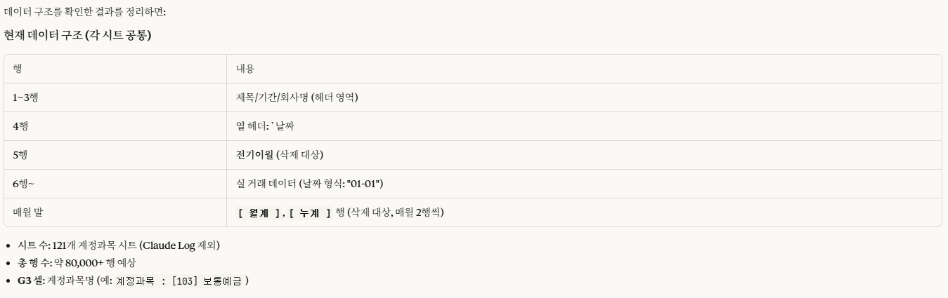 클로드가 각 시트의 샘플 데이터를 읽고, 전체적인 데이터 구조를 스스로 분석합니다. -