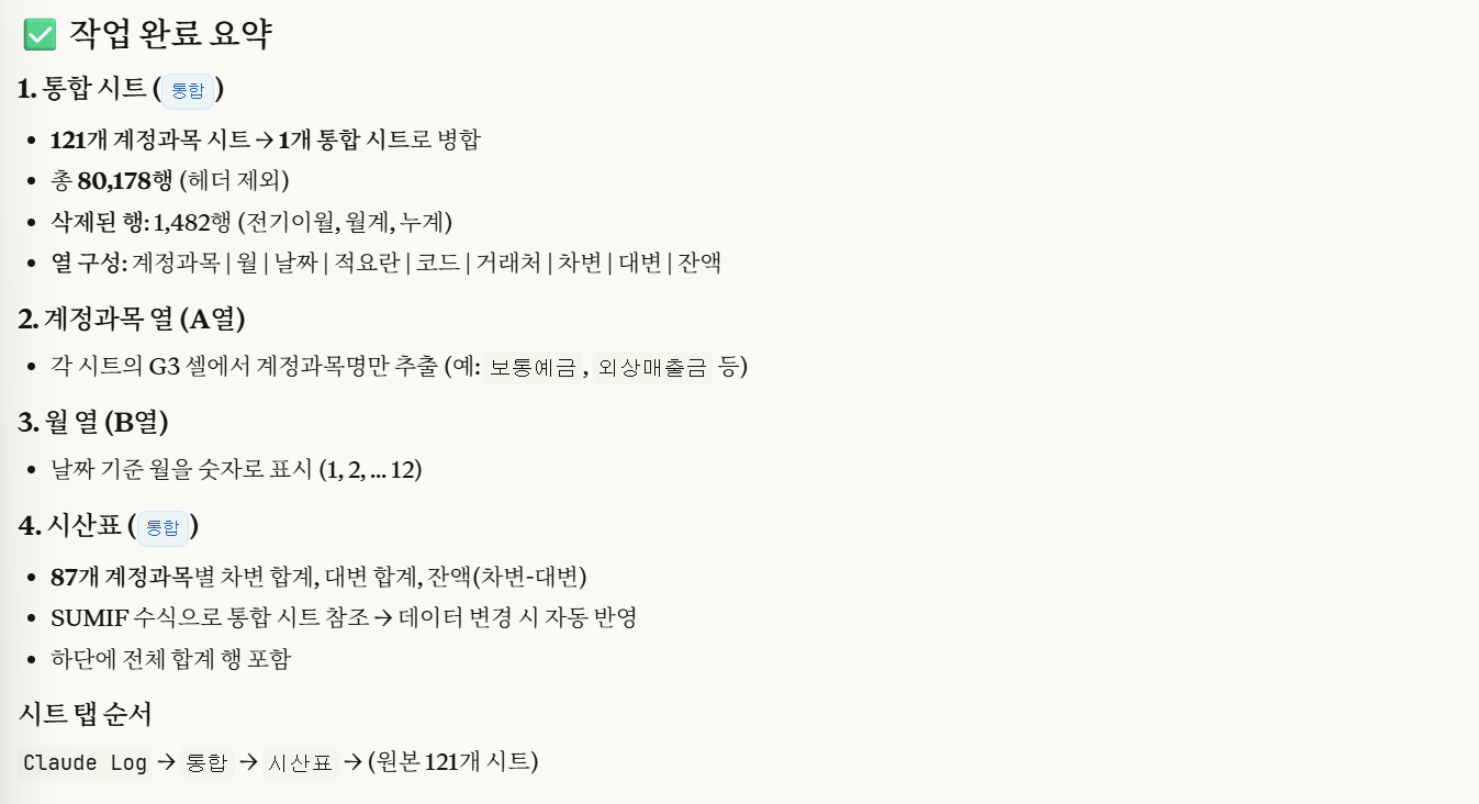 요청한 열 순서대로 깔끔한 총괄표가 완성되었습니다. 특히 주목할 부분은 합계 오류가 있었던 셀에 메모(주석)가 추가되어, 클로드가 어떤 근거로 그 숫자를 기입했는지 사용자가 쉽게 검증할 수 있도록 남겨두었다는 점입니다.