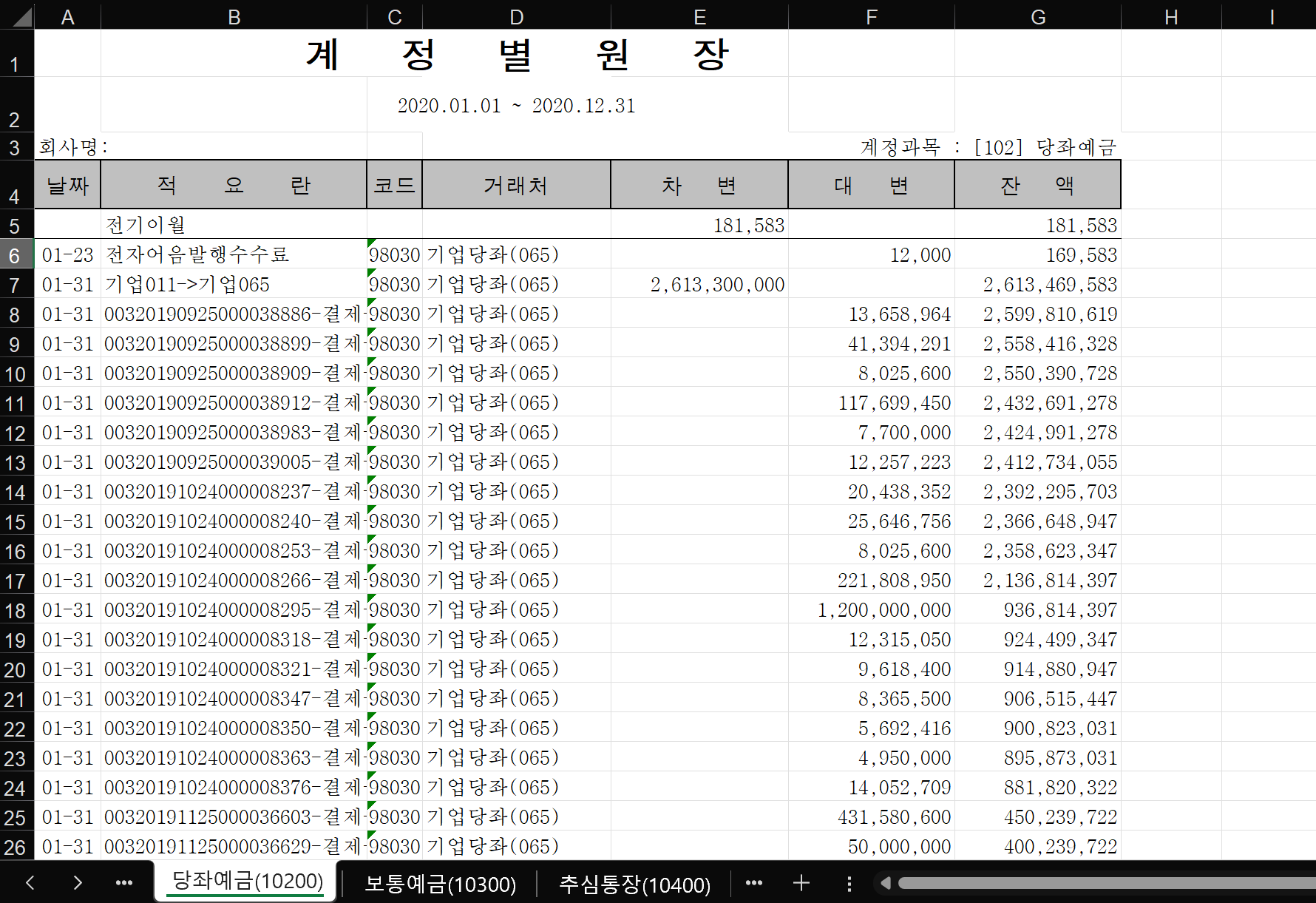 - 계정별 원장이 하나의 시트로 통합되어 있지 않고, 각 계정과목별로 시트가 나뉘어 있습니다.