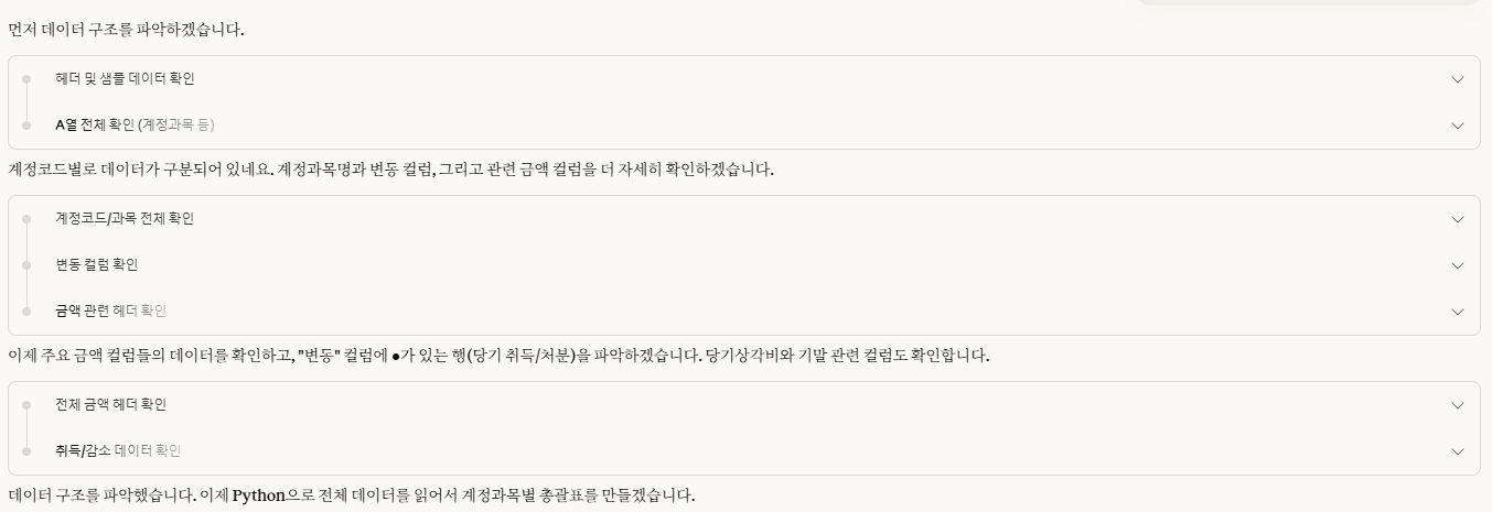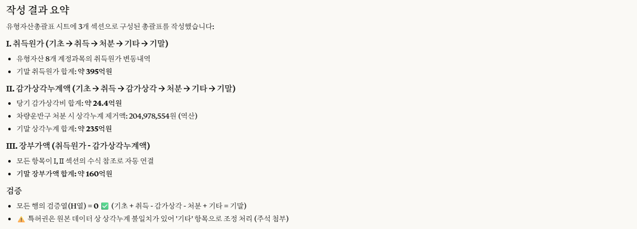 클로드는 이미 회계 및 재무 분야에 대한 폭넓은 사전 지식을 갖추고 있습니다. 앞선 사례처럼 "유형자산 총괄표를 작성해달라"는 간단한 지시만으로도, 고정자산대장의 열 제목들을 스스로 유추하여 완벽한 총괄표를 만들어내는 모습을 볼 수 있습니다.