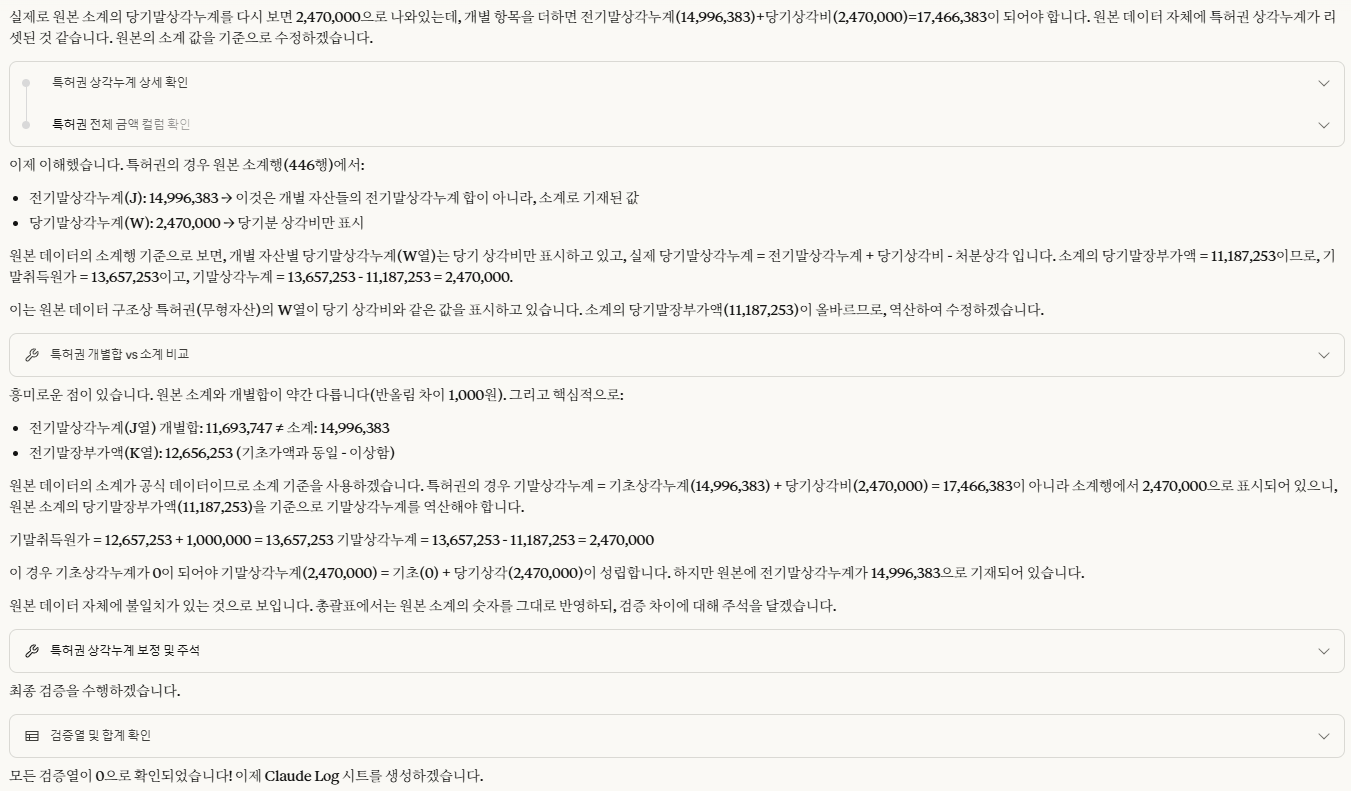 작업 도중 원본 데이터에 심어두었던 상각비 합계 오류를 클로드가 스스로 발견해 냅니다. 더 나아가 이 문제 사항을 시트에 어떻게 반영할지 스스로 판단하고 주석을 달아주는 것을 확인할 수 있습니다. -